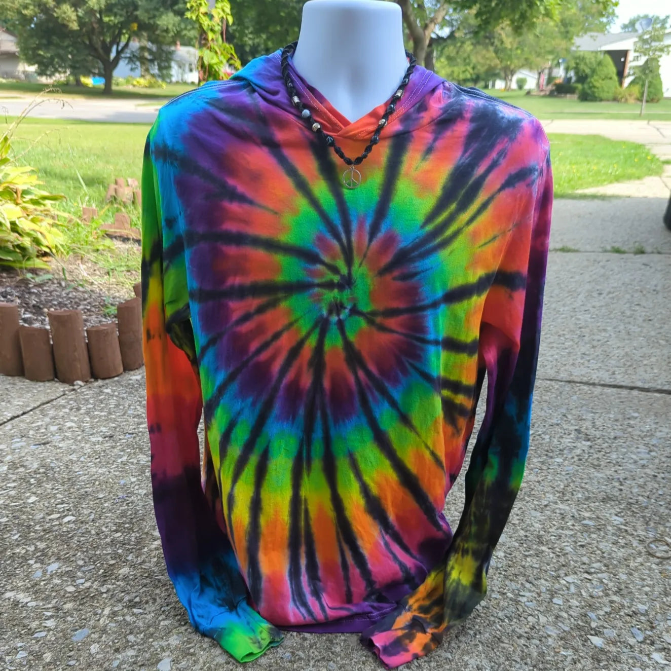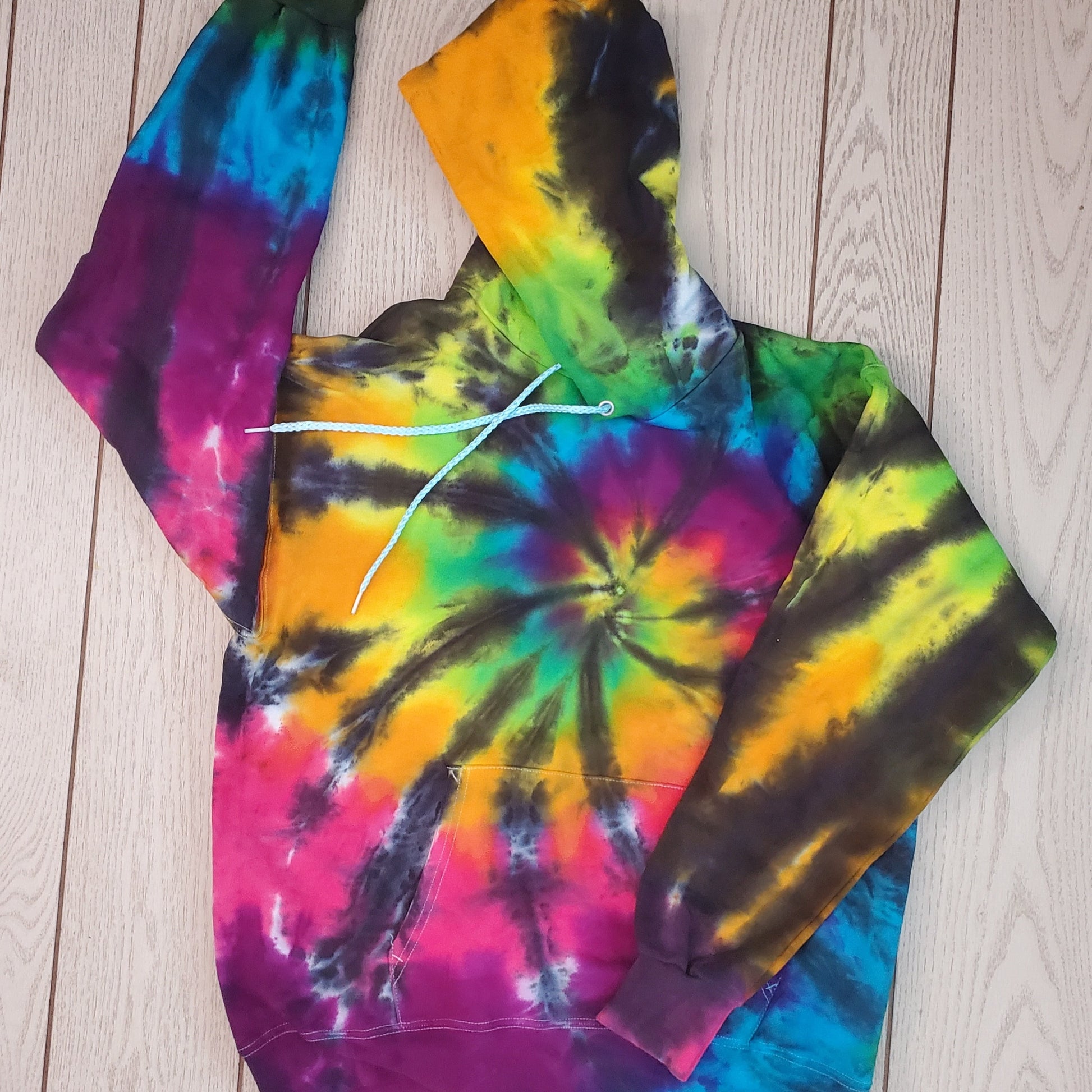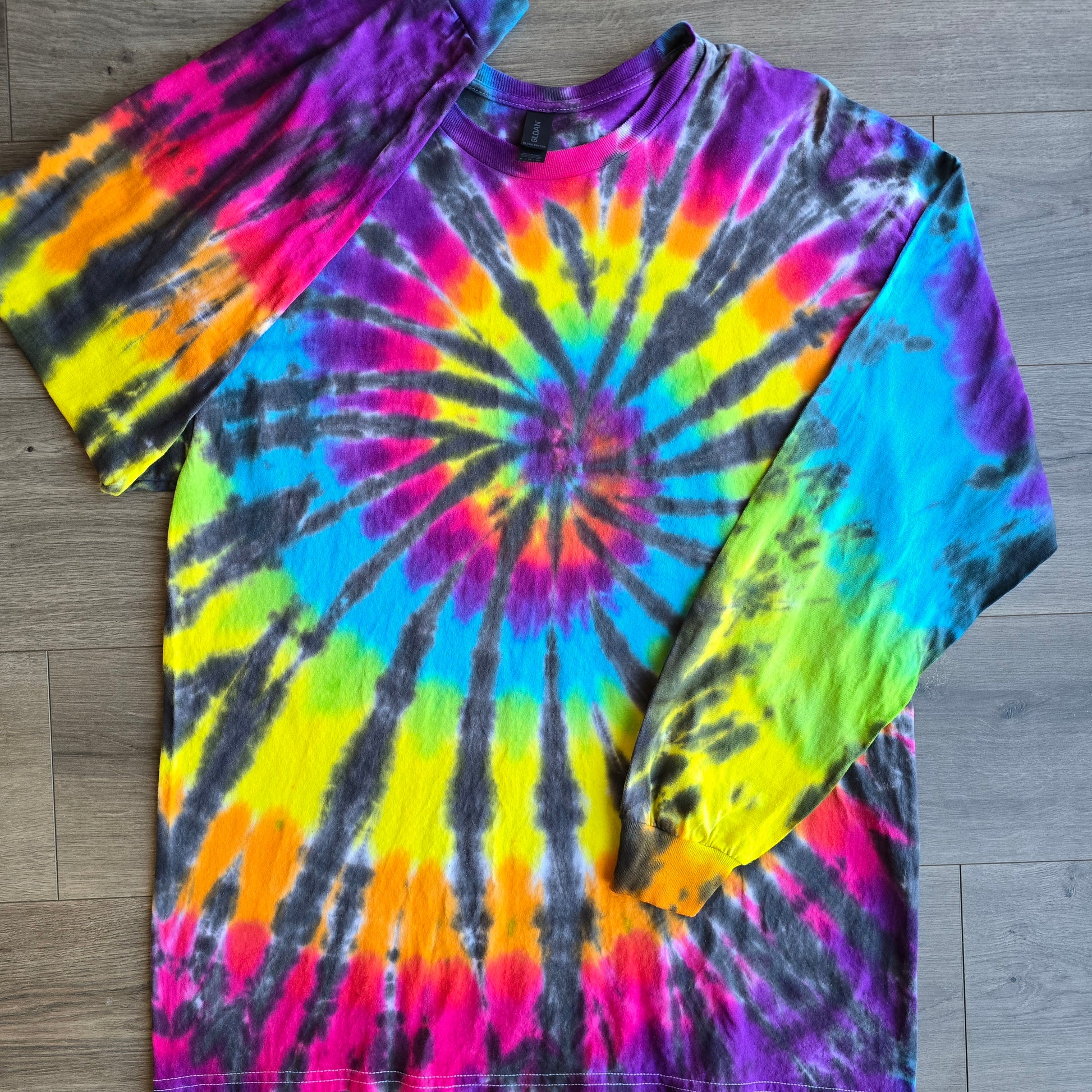 Experience the brightly colored charm and stark contrast of our Hand-Dyed Black Rainbow Firework Spiral design! Created using our brightest rainbow paired with our starkest black, each piece is unique and no two garments are the same.