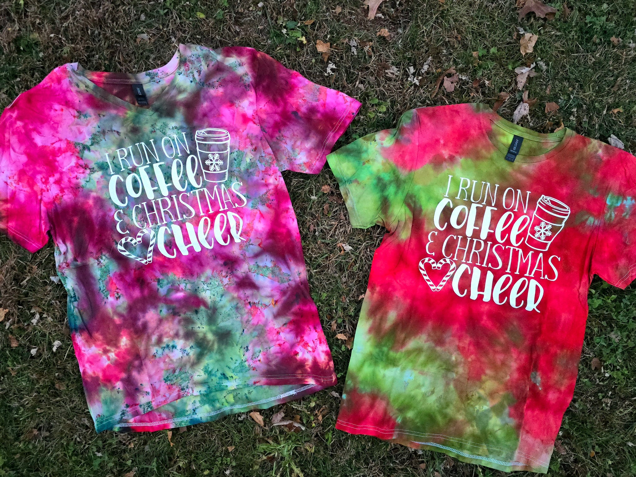 Embrace the holiday spirit with our "I Run on Coffee and Christmas Cheer" tie-dye graphic tee! Perfect for coffee lovers who adore the festive season, this shirt features a vibrant ice-dye design that adds a fun flair to your wardrobe. Available in adult short and long sleeves.