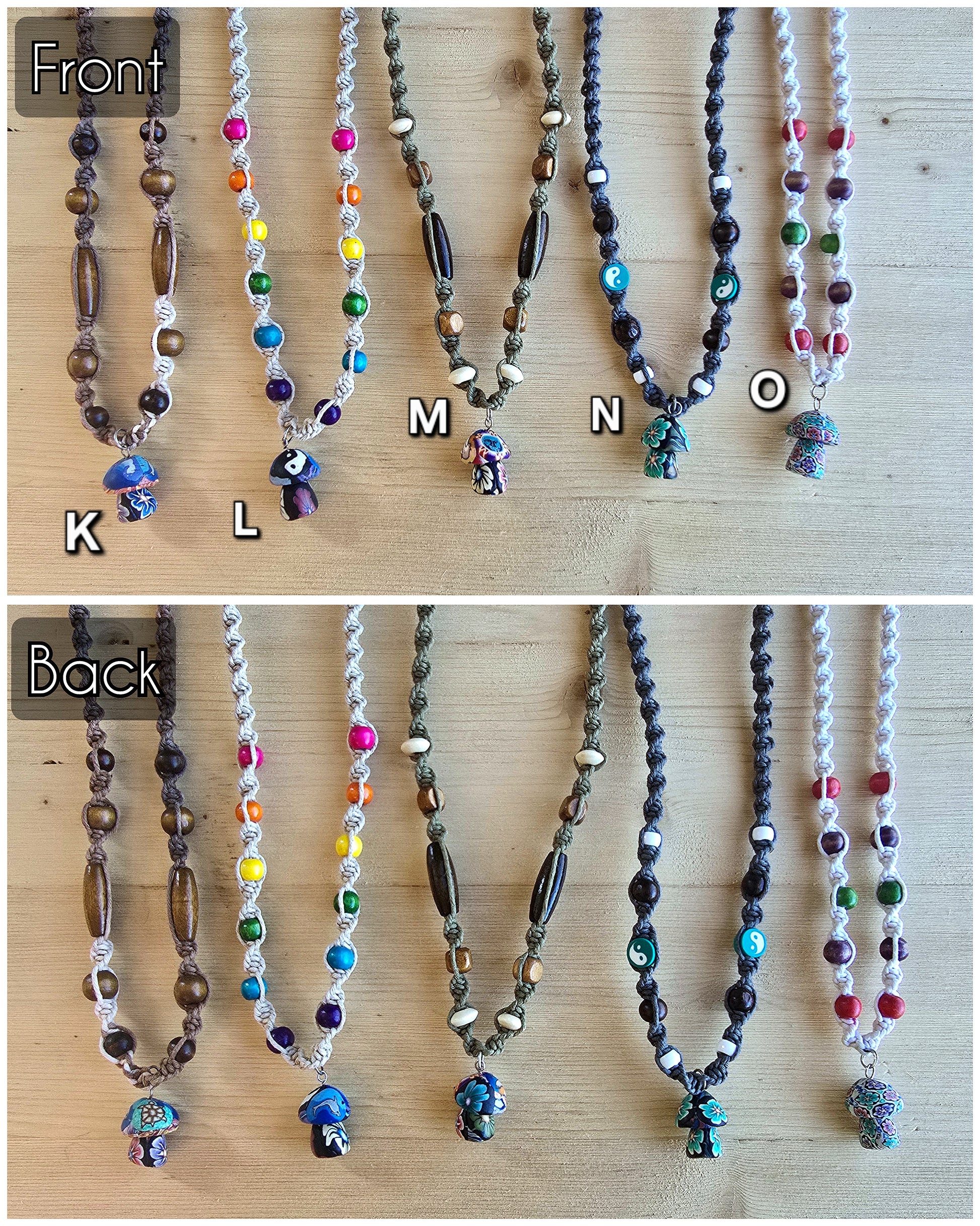 Each of these hemp necklaces is hand-tied in-house by me, making every piece truly unique! Featuring colorful Fimo Disc and Mushroom pendants, they add a fun, earthy vibe to any look. The Fimo Discs display the same image on both sides, while the Mushrooms have 360-degree designs—though front and back are subjective, so you can wear them however you like!